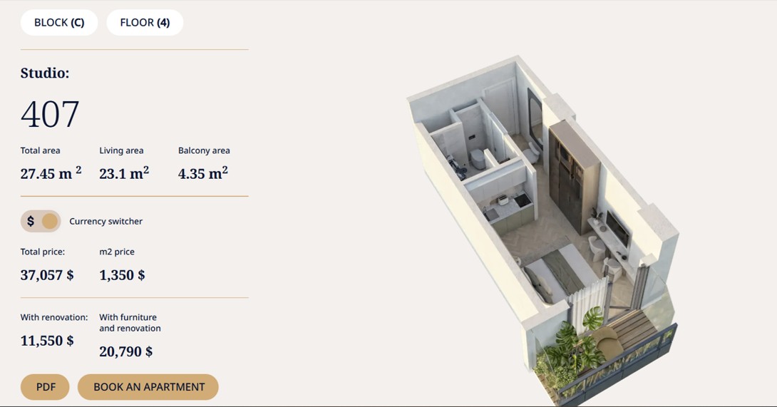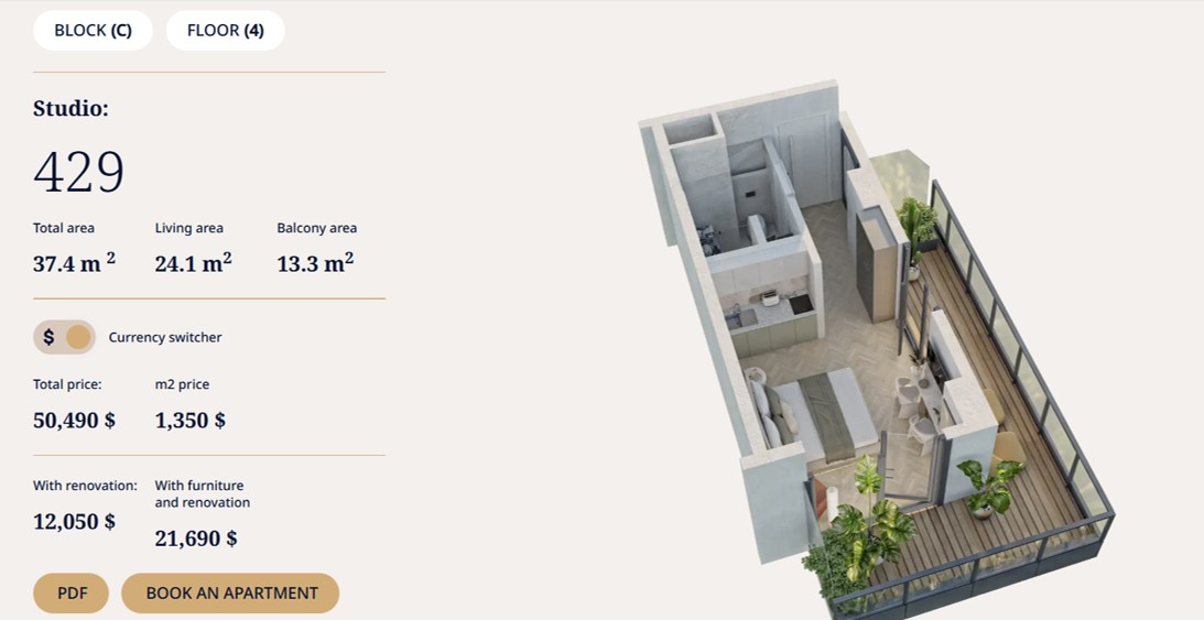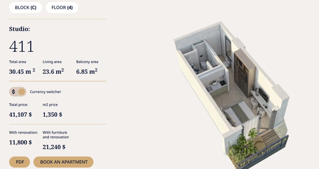 Les conditions de base pour l’achat et les paiements échelonnés sont flexibles à ce stade. Des paiements forfaitaires et des plans de versements internes sans intérêt sont disponibles jusqu’à l’achèvement du projet. Pour les plans de versements, un acompte initial de 30 % est requis, et le solde restant peut être payé en plusieurs fois jusqu’à la fin de la construction. Chaque bloc du projet a une date d’achèvement différente.