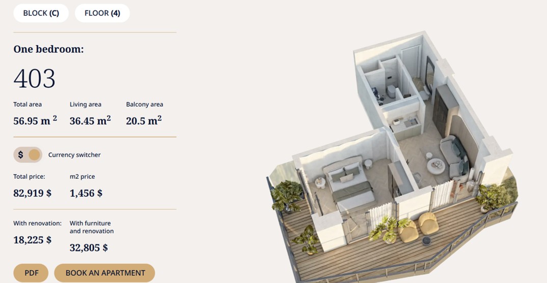PETRA SEA RESORT propose une gamme variée de logements, allant du studio au T1, avec des surfaces comprises entre 27 et 57 m². Ces appartements de style européen sont vendus en condition « White Frame* » (murs plâtrés, cloisons intérieures, sols posés, installations de base pour l’électricité, le gaz, l’eau et internet), offrant ainsi la possibilité de personnaliser selon vos envies. Les balcons ouverts offrent des vues exceptionnelles sur la mer et les espaces verdoyants environnants.
